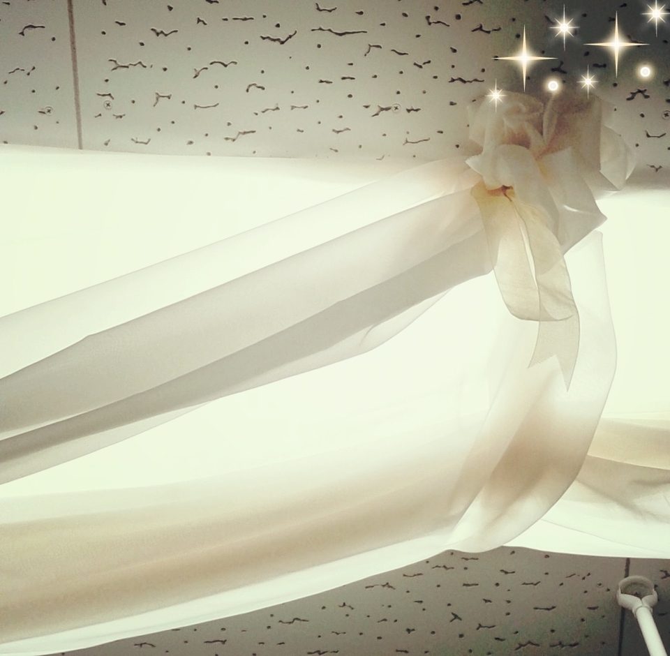 程よい透け感のあるクリーム色の生地で覆い、端にお花を作りました